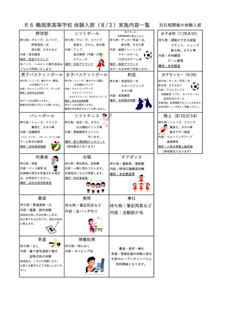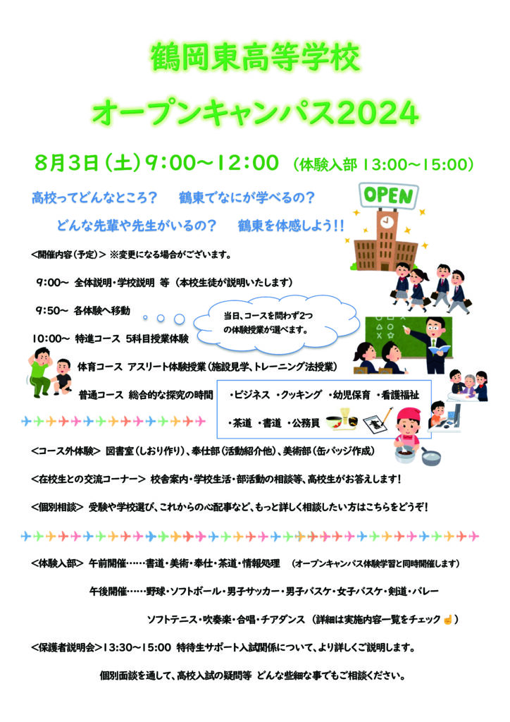 2024.07.31 8月3日(土)鶴岡東高校 オープンキャンパス・体験入部について