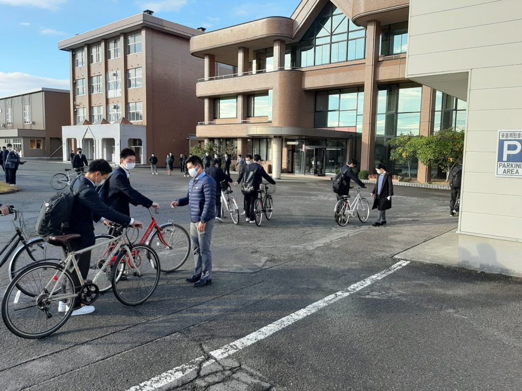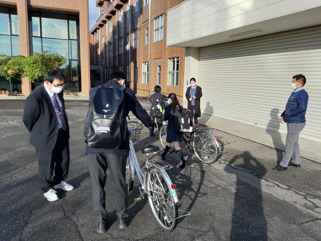 朝の登校時間に合わせ、あいさつ運動、自転車の点検、通学路での立哨指導などを行い全校生徒が安全に学校へ登校できるようにとの目的がある取り組みです。