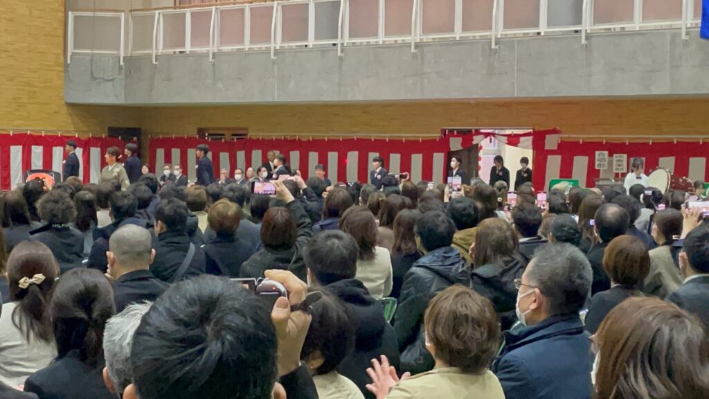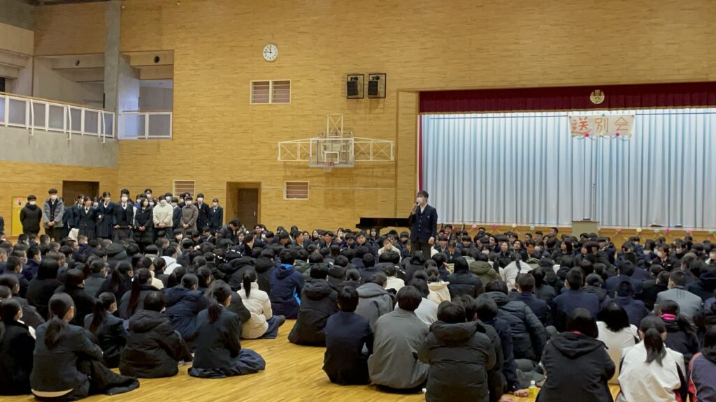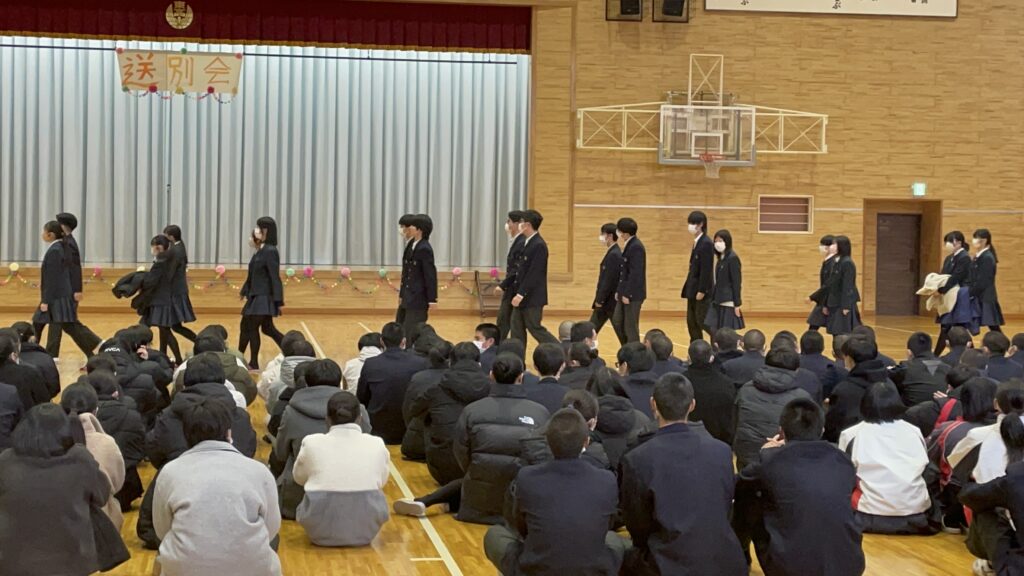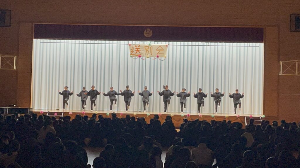 1、2年生がお世話になった先輩たちに感謝の気持ちを込めて、工夫を凝らした歌やダンスなどの出し物を披露しました。