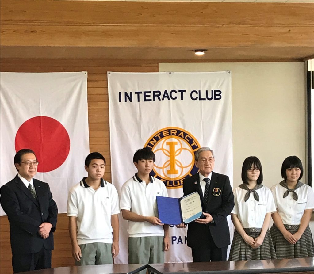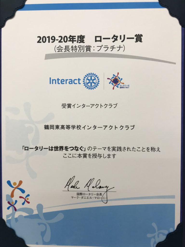 国際ロータリーから贈られる2019~2020年度のロータリー会長特別賞「プラチナ賞」を鶴東奉仕部(インターアクトクラブ)が受賞し、8月25日(火)に表彰式が行われました。